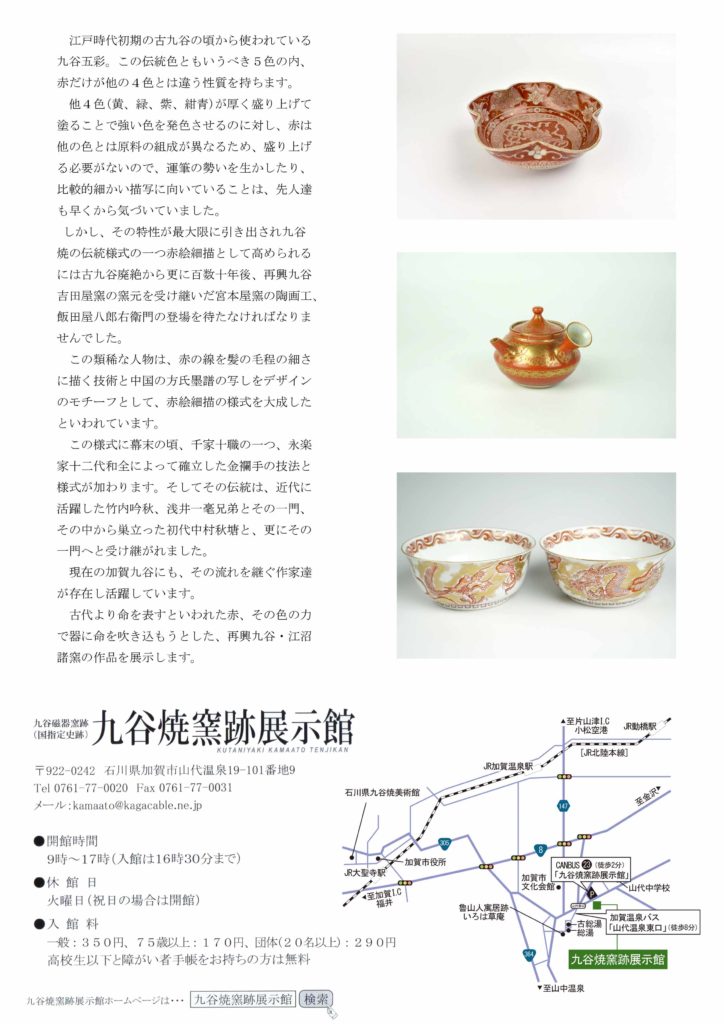 2026.01.21 2025年度冬期企画展~九谷焼窯跡展示館~ 九谷焼窯跡展示館 九谷焼窯跡展示館 令和7年度 冬期企画展 江沼九谷の流れ 加賀九谷 赤の系譜 【開催期間】令和8年1月21日(水)~同年7月6日(月)※4月15日(水)より一部展示入れ替え 加賀九谷 赤の系譜 詳細はこちら